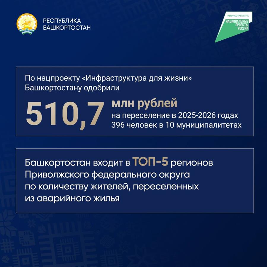 На новый этап программы по расселению аварийного жилья в рамках нацпроекта "Инфраструктура для жизни" Башкортостан получит из федерального бюджета более полумиллиарда рублей. До конца 2026 года в 10 муниципалитетах переселят 396 человек из помещений общей площадью 7,9 тысячи кв. м.