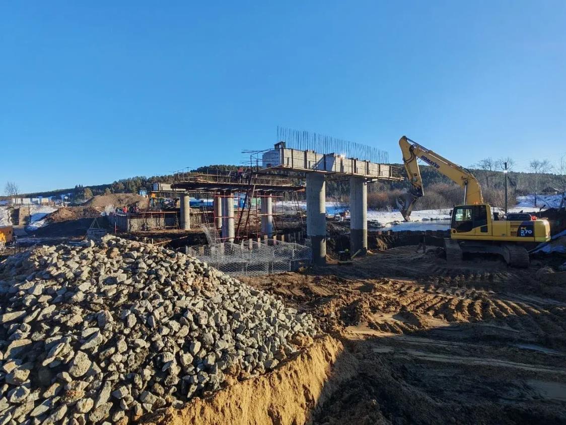 Параллельно началось возведение габионов. Также на стройплощадку завозят материалы для обустройства будущей насыпи. После начала нерестового периода рабочие приступят к работам на подходах и мостовому полотну.